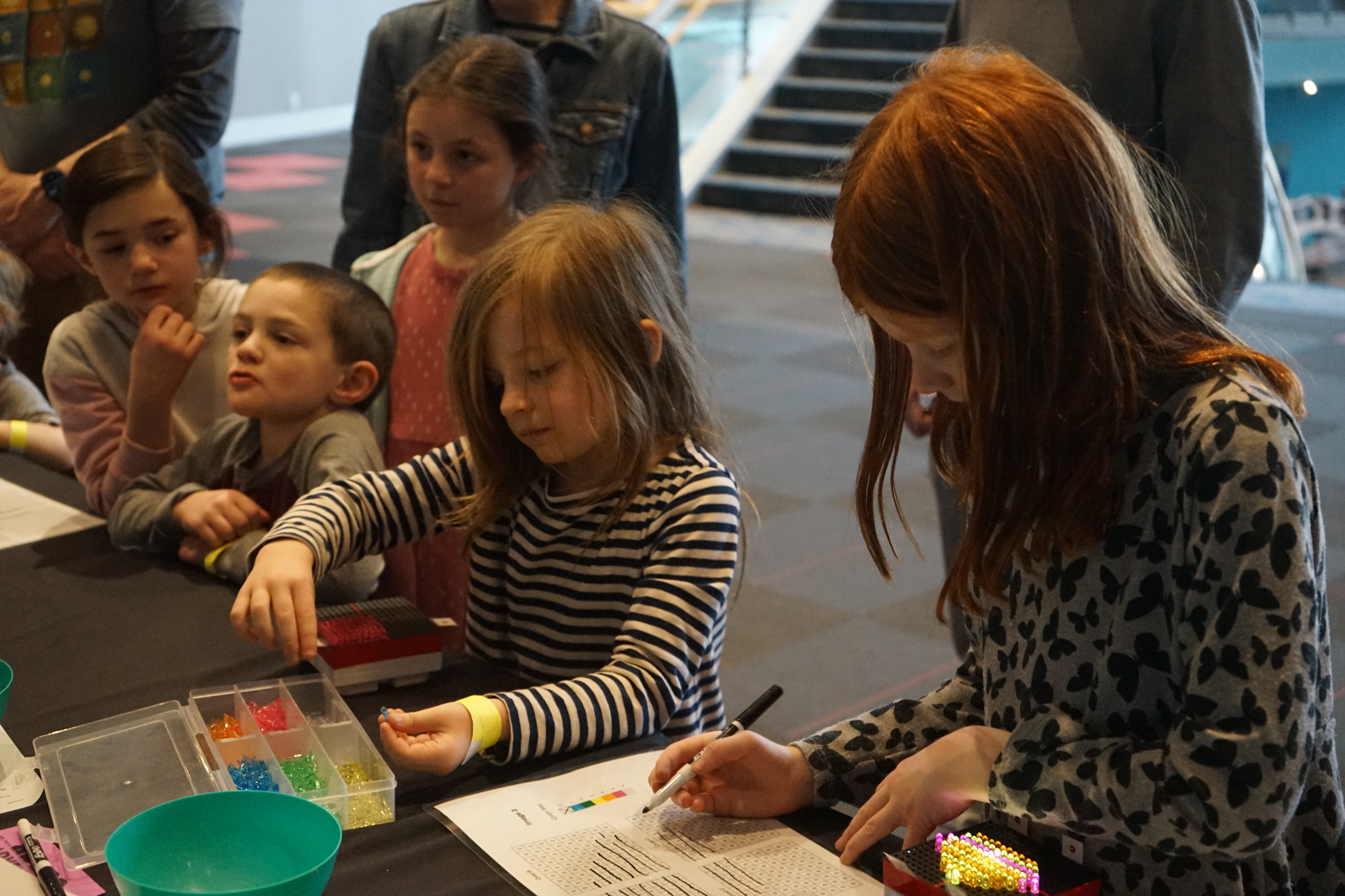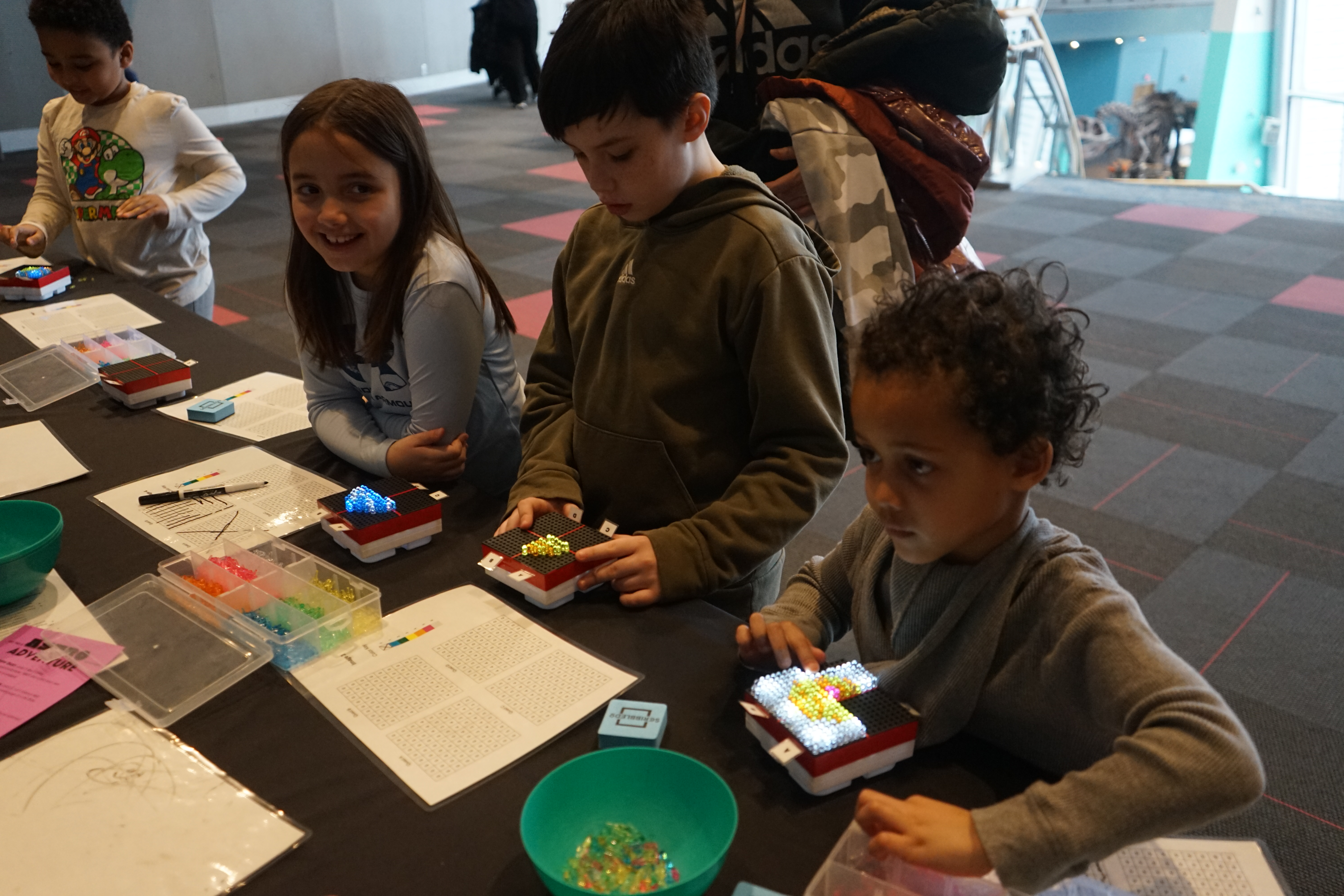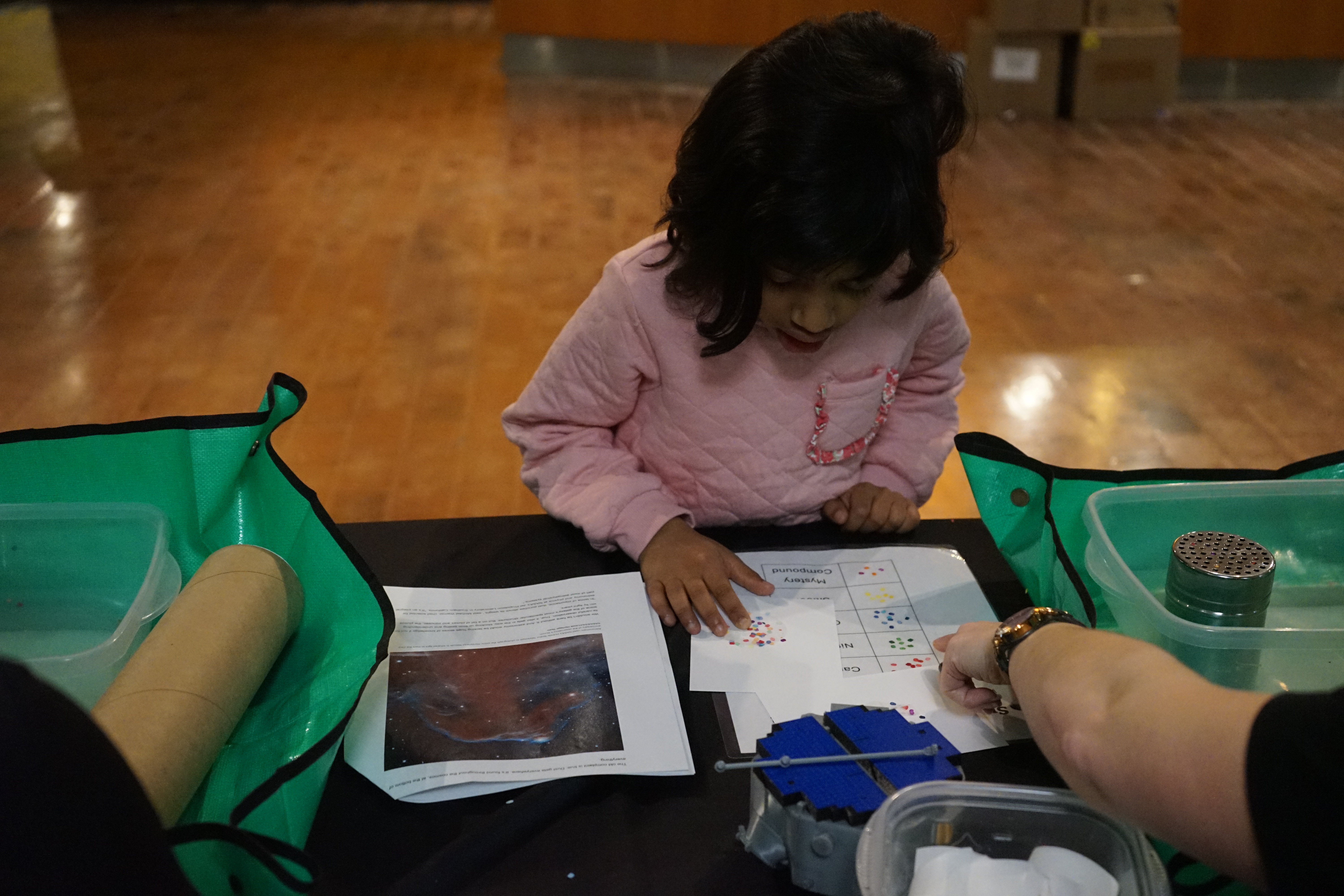 We had 942 people join us for Astro Adventure Day which is one of my favorite events at MSC and I am happy to share that IMAP was apart of it this year. We took two of the activities and modified them to a more pop up oriented activity. We found Communication in Color, while fun, groups often couldn't stay long enough able to complete the full light bright picture so we decided that each group would add a little bit to each light bright until we had the full picture but we did still run into issues as groups had a hard time finding where the last group left off on the guide sheet and we still couldn't get a full completed picture with the pop up style activity. So to make the activity work for our pop ups we decided instead of using four light bights for one picture we would split each light bright into four quadrants and have each group do one quadrant that way we could start getting fuller pictures. We also lamented the guide sheets so guests could easily mark off which squares they had filled in making it easier for them to keep their spot and make it so the next person could easily pick up where they left off. This activity was so fun we actually bought ourselves extra light bights! The other activity was Space Dust. The activity was modified to match more closely to our age ranges and make it less messy. We replaced the dust with multi colored confetti as it is much more manageable than glitter and only used one shaker for each guest. We assigned each color with different elements you can find out in space. We had guest attach a thing of sticky paper to the bottom of the tube and then shake the dust in this allowed them to easily analyze their sample and even take the sample with them.