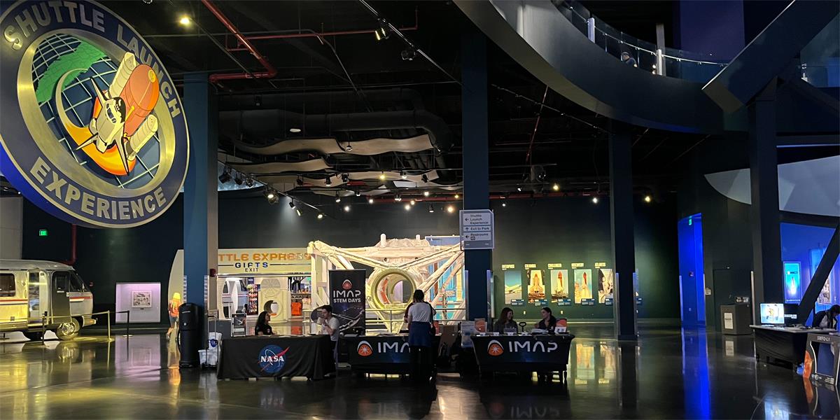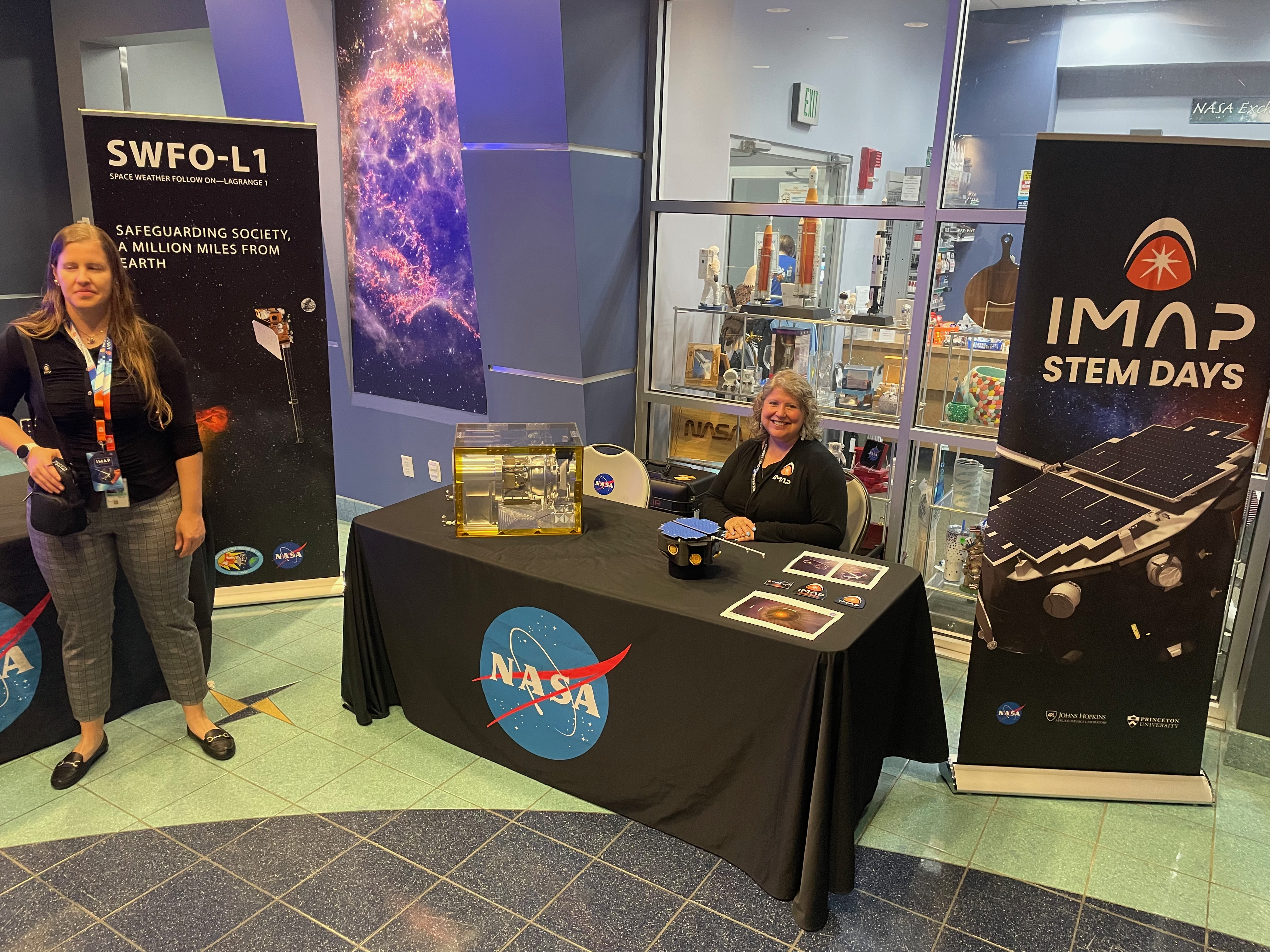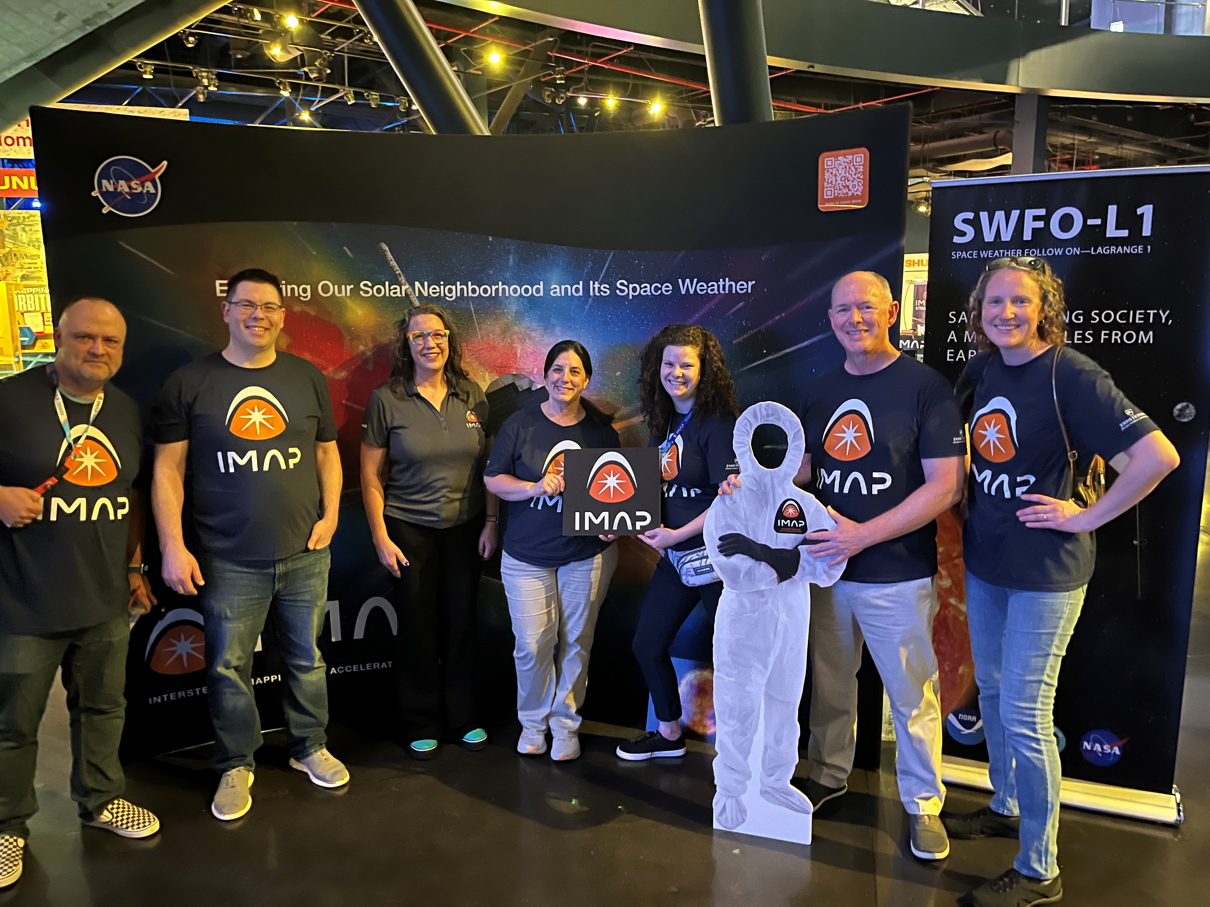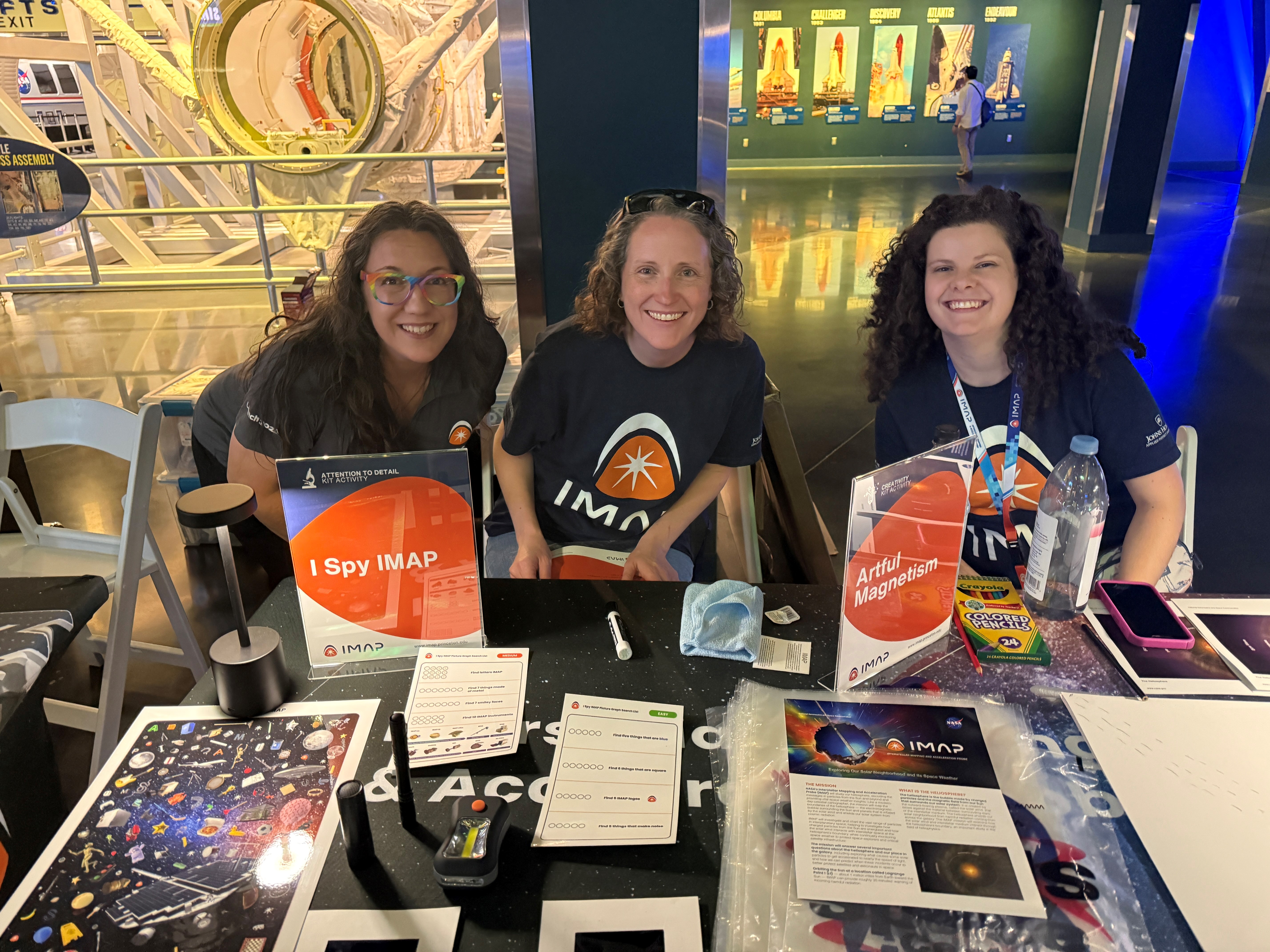 Outreach tables in the Atlantis building were packed all week long! We teamed up with our rideshare partners —Carruthers Geocorona Observatory (Carruthers) and Solar Wind Follow On–L1 (SWFO-L1) — to share our collective mission stories. Visitors got hands-on with several IMAP activities from our outreach kits, and a spinning 3D-printed model of IMAP was a definite crowd magnet. Between the selfie banner, the IMAP branded items (including launch-exclusive magnets and posters), and the parade of IMAP team families and NASA HQ leadership stopping by, it was four days of nonstop engagement and enthusiasm! We loved getting to connect with the KSCVC global and local guests that also came through and seeing all the curiosity that was sparked about the Sun's influence and the boundary of our solar system!